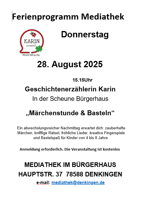 21.06.2026 15.00 Uhr | Ateliers im Alten Schlachthof e.V. Georg-Zimmerer-Straße 7 72488 Sigmaringen | Eine Reise ins Reich der Fantasie Märchenhafte Erzählstunde mit Karin Putz, freie Erzählerin Hört ihr das? Die Märchen rufen euch! Ohne Buch und ohne Skript, aber frei und lebendig, nur mit ihrer Stimme, ihrem Herzen und ihren Gesten erzählt Karin Putz wunderbare Geschichten, die euch mitten in die Welt der Märchen entführen. Ihr könnt nicht nur lauschen, sondern selbst Teil der Geschichte werden! Mitmachen, staunen, lachen und die Fantasie fliegen lassen. Kommt mit auf eine Reise voller Magie, Spaß und wunderbaren Erlebnissen! |